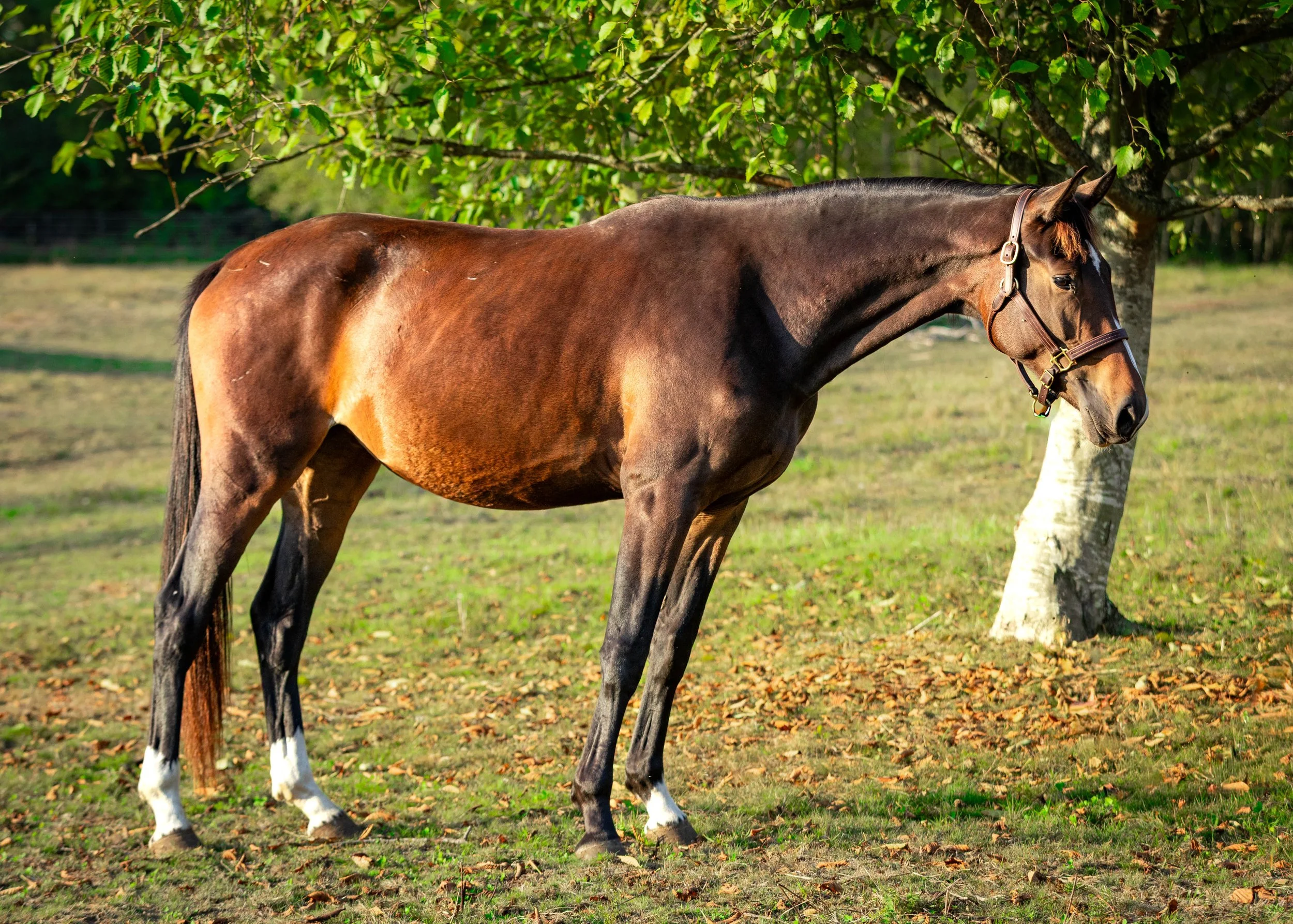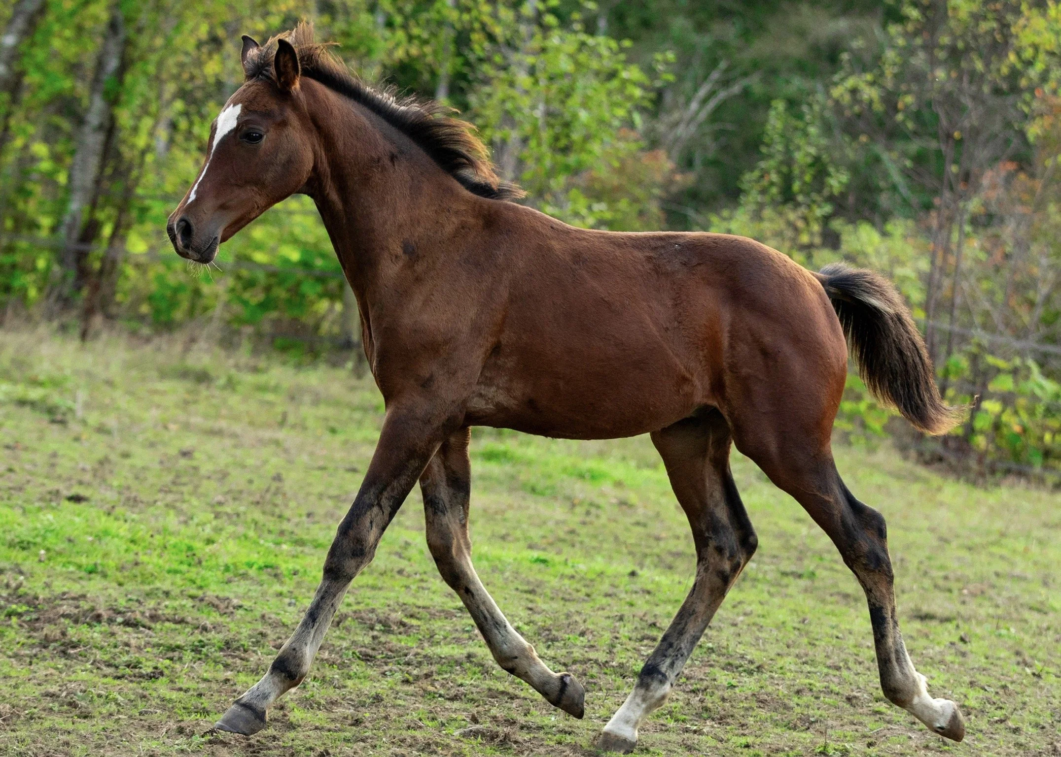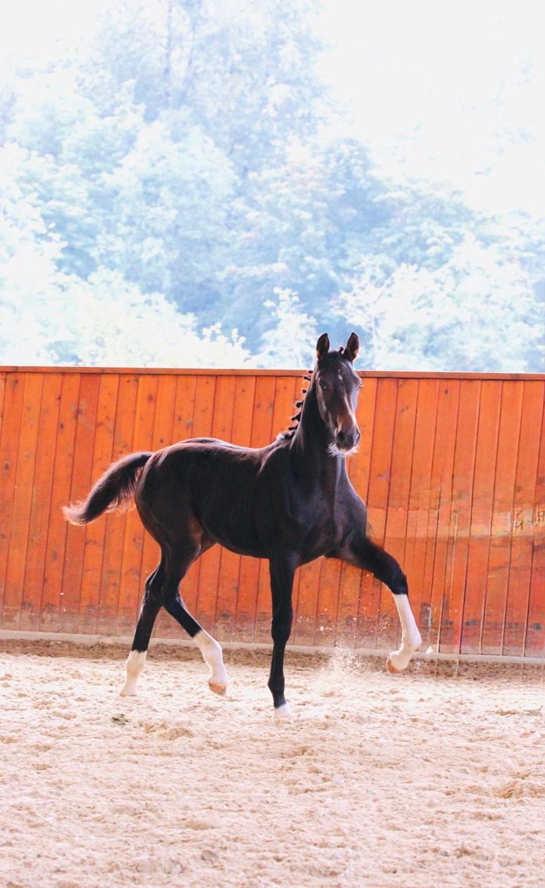 Sedona is a smart filly with a stunning blood bay coat, plenty of chrome and eye-catching movement. Her expressive gaits and and excellent confirmation and balance will get you noticed and remembered in the dressage ring. In her early training for inspection she quickly progressed and only needed to learn things once. She is easy to handle and stands well for the farrier and grooming. Lightly started. She has loaded and been trailered quietly several times. 16 hands and growing.